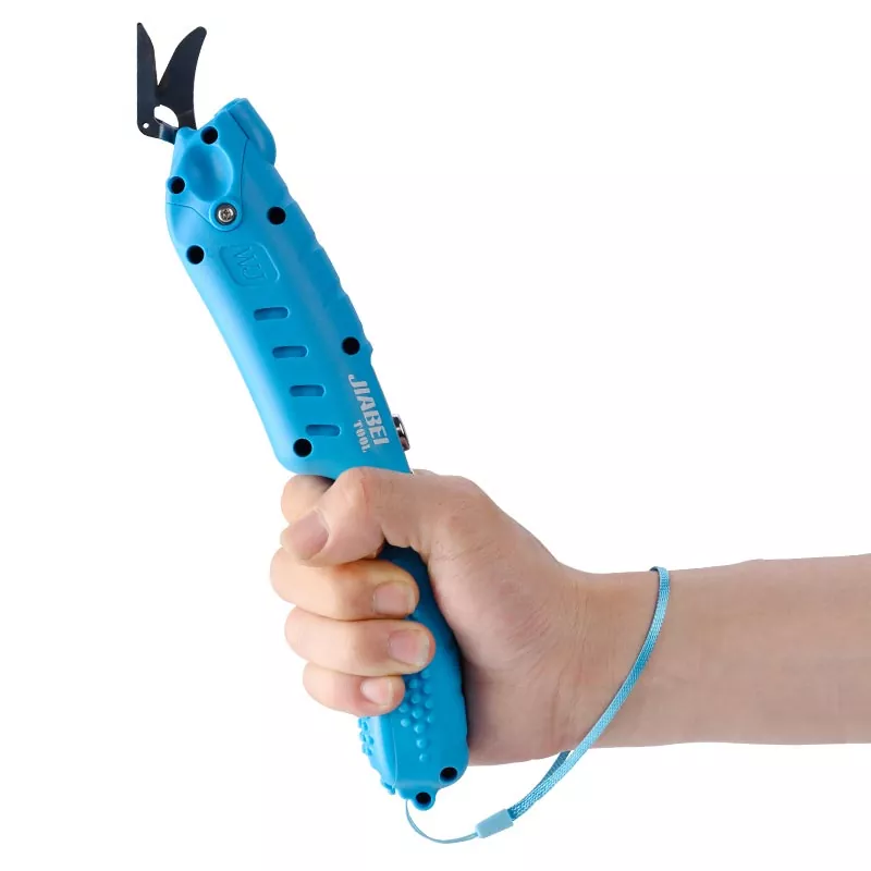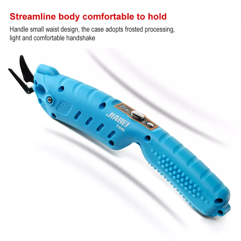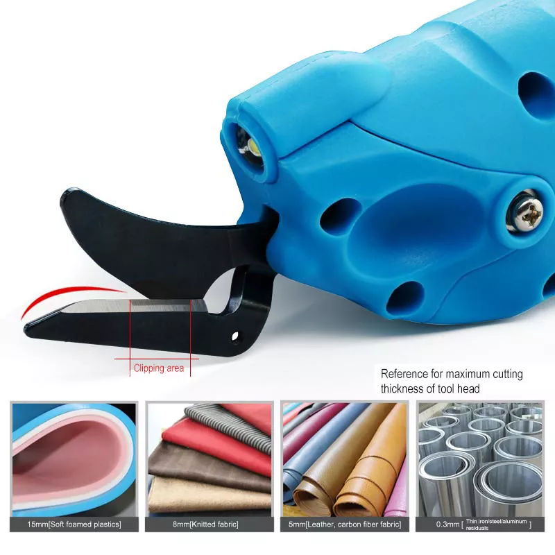 Jiabei -työkalu pieniä sähköisiä saksia käytetään laajasti tekstiilin, huovan, nahan, paperin, metallin ja muiden materiaalien sopivan paksuuden leikkaamiseen. Sitä voidaan käyttää leikkaamiseen, muotoiluun, seuraavien materiaalien leikkaamiseen: pehmeä vaahto 15 mm: n sisällä, neulottu kangas 8 mm: n sisällä, nahka- ja hiilikuitukangas 5 mm: n sisällä, ohut rauta, kupari ja alumiinilevy 0,3 mm: n sisällä.